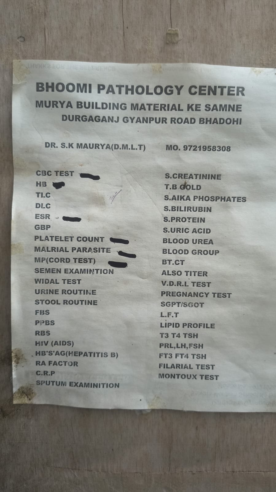 | Description | TEST AVAILABLE: CBC TEST, HB , MONTOUX TEST, C.R.P., RBS, STOOL ROUTINE, URINE ROUTINE, LIPID PROFILE, SEMEN EXAMINTION ETC. |